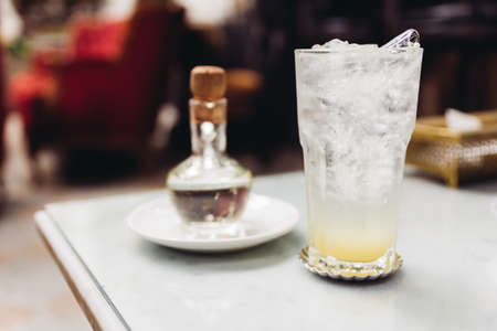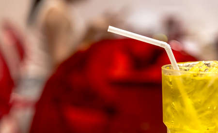 Ice chrysanthemum juice Chinese tradition soft drink on glass with white straw