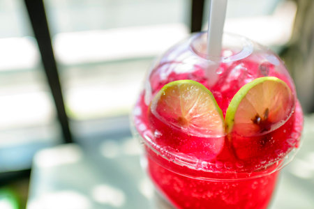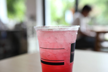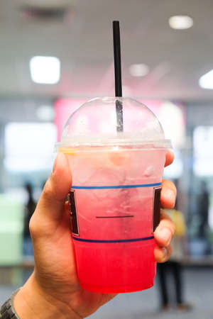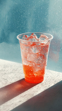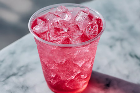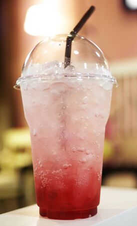 Red juice with ice in a plastic glass.