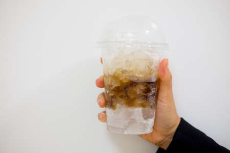 Man hand holding a glass of cola with ice on the table
