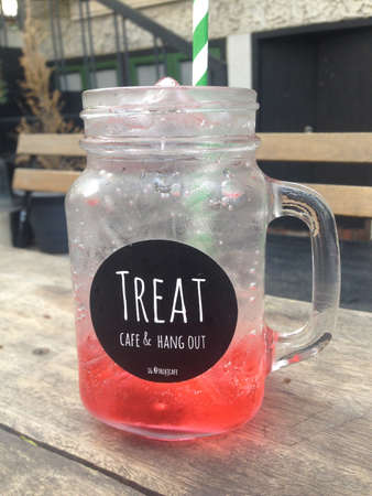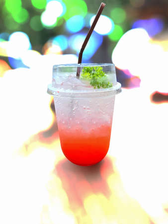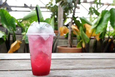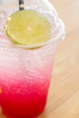 red juice water whit soda in glass on wood table at cafe. Summer drink