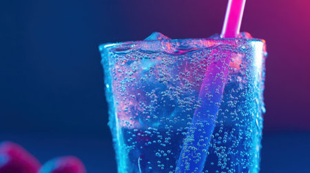 A blue raspberry soda in a tall glass, with tiny bubbles forming at the top, served with a playful neon straw.