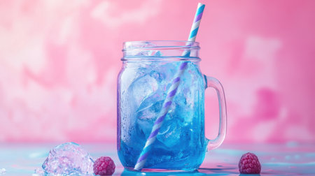 A vibrant blue raspberry energy drink in a mason jar, with crushed ice and a striped straw, set against a playful background.