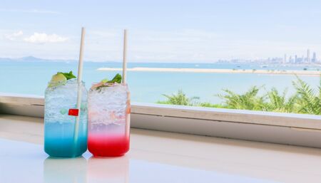 Blue and pink apple soda on a beautiful sea view