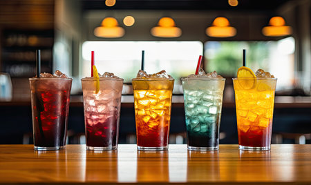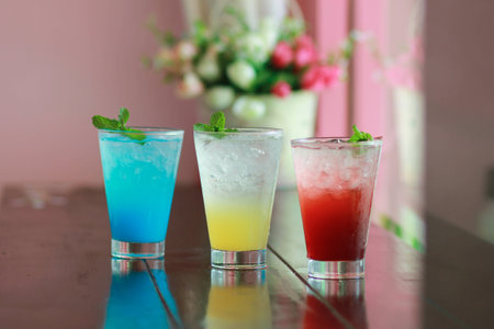Colorful cocktail cold drink arranged on table.