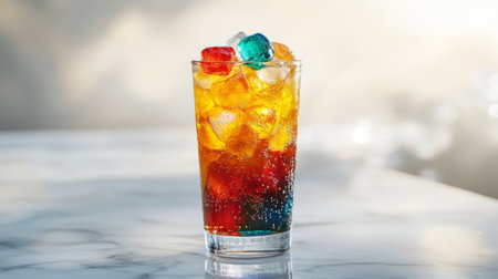 A vibrant and colorful drink featuring ice cubes, fizzing bubbles, and a beautiful presentation on a marble table. Perfect for summer refreshment!