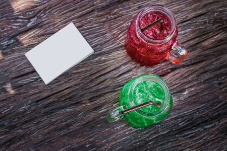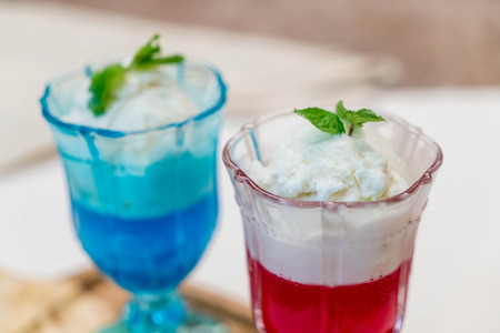 Iced black coffee and blue soda on wood table