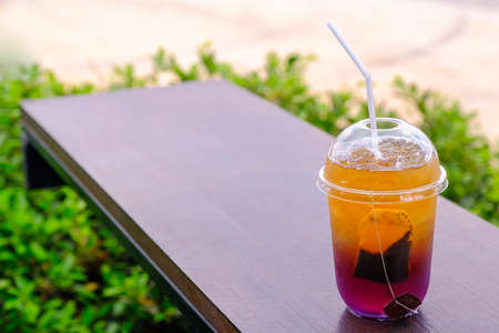 Butterfly pea tea with ice on a wooden table