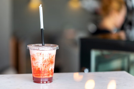 close up cold strawberry juice in platic glass