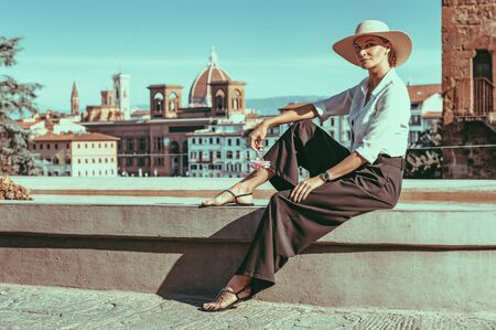 Portrait of a charming girl sitting near a fountain in Florence. View of Santa Maria del Fiore. Tourism concept. Italy. Mixed media