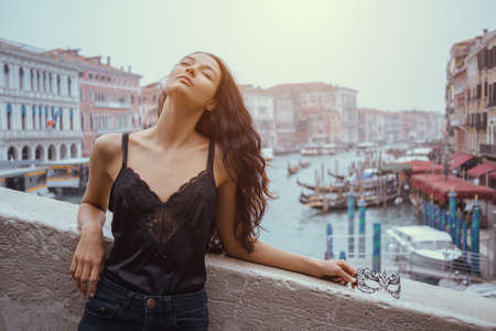 Woman with carnival mask in Venice. Attractive young sensual romantic woman standing on the pier against beautiful view on venetian chanal with boats and gondolas in Venice, Italy.