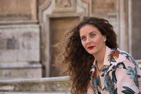 Classy lady with pink wide hat in a picturesque lagoon town in Europe, Caucasian woman but with Middle Eastern and Arabic traits