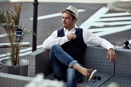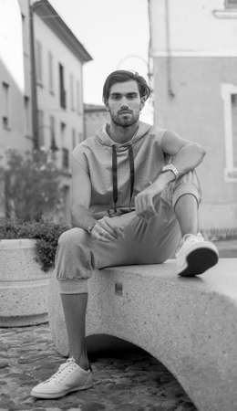 Young fashionable guy on the streets of a European town, sitting on the porch of the house. Black-and-white photo.