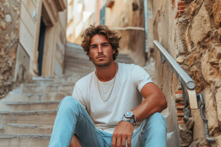 Portrait of a handsome young man sitting on the stairs