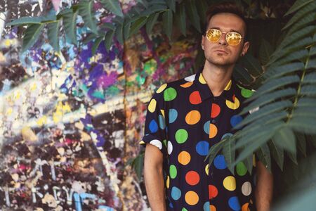 fashion guy in retro glasses stands under a palm tree against the background of a graffiti wall in retro clothes
