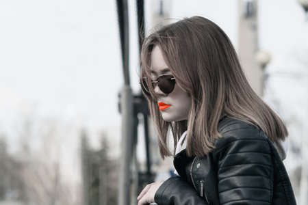 A young girl in stylish glasses and a leather jacket on a suspended pedestrian bridge
