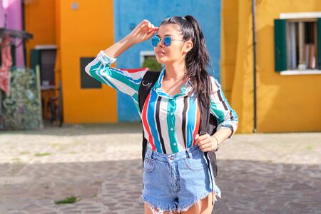 girl with a backpack visits a colorful Italian town