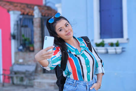Happy young girl making pictures of herself through cellphone, over old italy small town