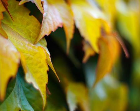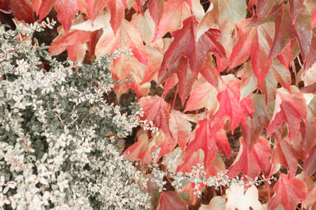 Autumn colors. Early leaves of ornamental grapes. Selective focus. Blur effect.
