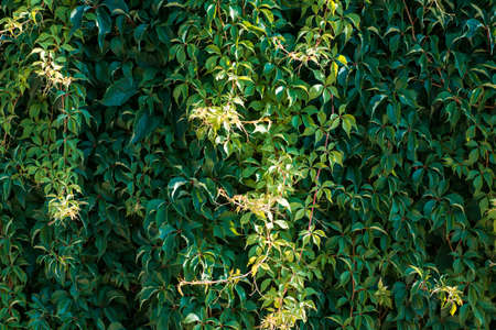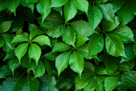 Lush green leaves background of virginia crepeper or victoria creeper. Beautiful garden foliage natural texture or pattern