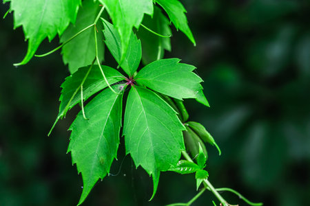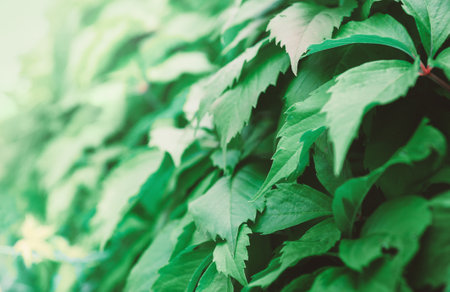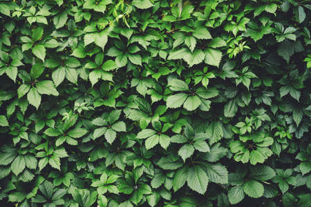 Closeup macro of Virginia creeper plant five-leaved ivy with green leaves. Toned with retro vintage filters. Textured natural green abstract background.