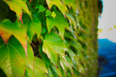 Wall covered with green and yellow leaves of wild grape. Natural background.
