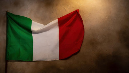 An Italian fan stands with hand over heart, enveloped in the tricolor flag. The warm, cinematic lighting enhances the emotional intensity of the moment.