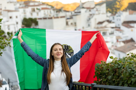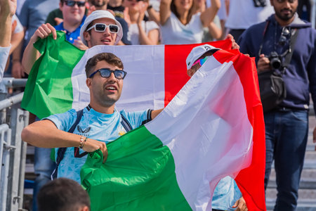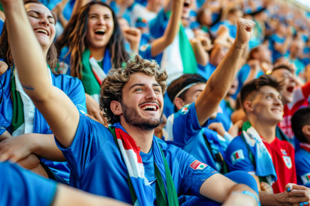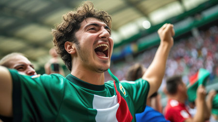 A happy fan at a public event in a stadium, holding an Italian flag with a smile and making a gesture, while enjoying the fun and leisure with a cheering crowd. AIG41