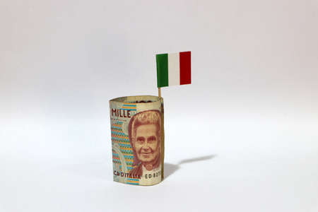 Rolled banknote money one thousand Lire Italy and stick with mini Italia nation flag on white background. Concept of financial business.