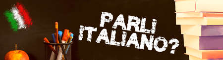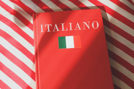 red Italian language textbook with Italian flag and Italian inscription in Italian lies on red and white background, foreign language learning concept.