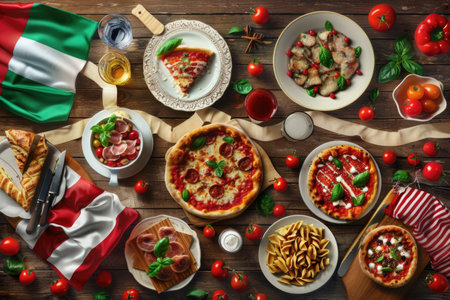 Republic Day Celebration in Italy with Waving Flag and Traditional Cuisine on Wooden Background AI
