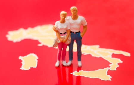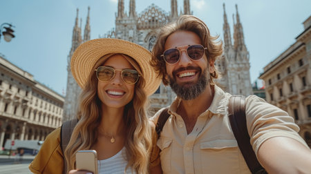 The Duomo cathedral in Milan, Lombardia - Two tourists enjoying a romantic summer vacation in Italy - Holidays and traveling lifestyle concept.
