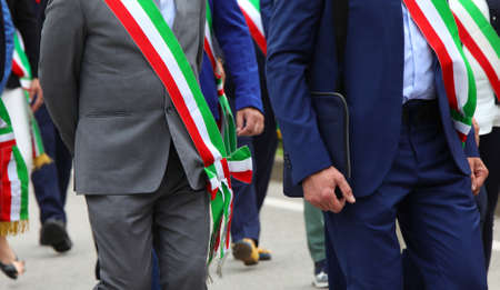 Many italian MAYORS with stripe called MAYORAL CREST during parade