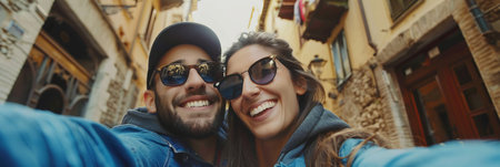 Stylish couple posing for a selfie on a city street during their summer vacation, capturing the excitement of urban exploration.