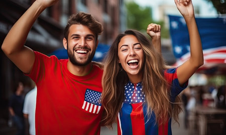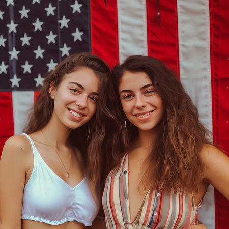 A group of happy young friends with an American flag in the background. The friends are smiling and looking at the camera. The image is perfect for use in advertising, marketing, and social media.