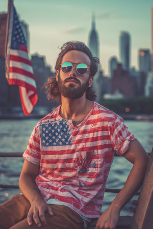 Hurrying to be in trend Handsome young bearded man wearing sunglasses and running along American flag : Generative AI