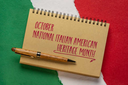 October - National Italian American Heritage Month, handwriting in a spiral notebook against paper abstract in colors of national flag of Italy (green, white and red), reminder of cultural event