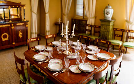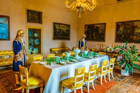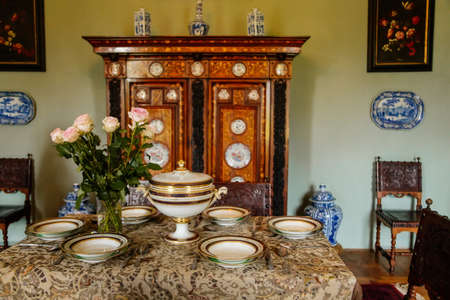 Velke Brezno, Czech Republic, 26 June 2021: chateau Velke Brezno, castle interior with baroque furniture in dining room, cupboard and table covered with tablecloth, surfer porcelain dishes and plates.