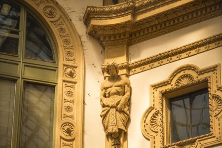 Facade of an old classic yellow building in the historical center of Naples, Italy
