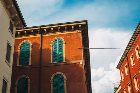 Beautiful old buildings on Verona street, Italy. Amazing blue sky. selective focus.
