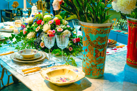 beautiful plate and fresh perfect colorful flowers standing on luxury table