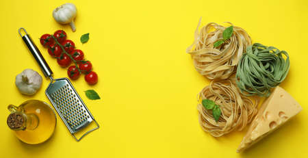 Collage menu design mediterranean cuisine dishes pasta and bruschettas top view, horizontal