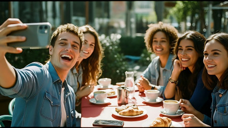 Cheerful friends taking selfie on smartphone while having breakfast in cafe