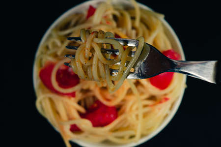 Spaghetti pasta with tomatoes and olive oil photography on the dark background. Healthy and fresh.