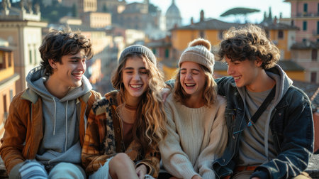 Four joyful friends laughing on a windy beach day, with wild hair and casual clothing, embodying happiness and friendship.