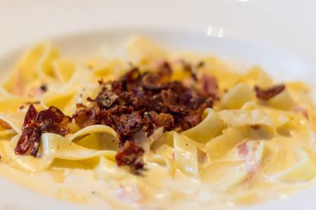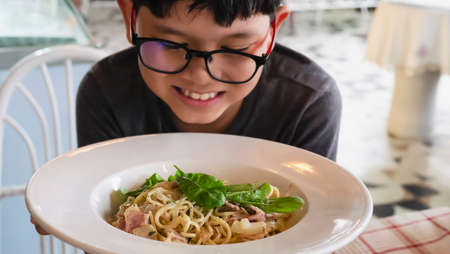Boy happy eating spaghetti carbonara recipe - people enjoy with famous Italian dish food concept