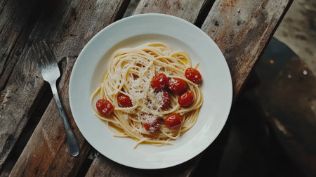 A vibrant plate of spaghetti topped with fresh cherry tomatoes and cheese, served on a rustic wooden table, showcasing the beauty of Italian cuisine.