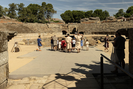 Historical reenactors dressed in Roman attire enter the ancient Roman amphitheater in Merida, Spain. The scene brings to life the rich history and culture of the Roman Empire.