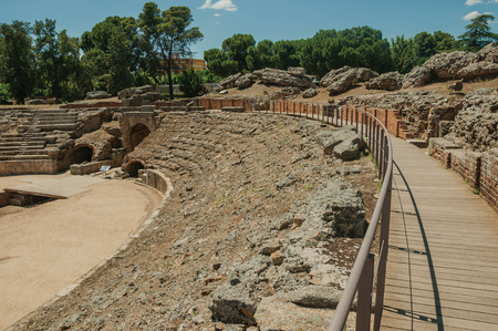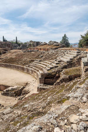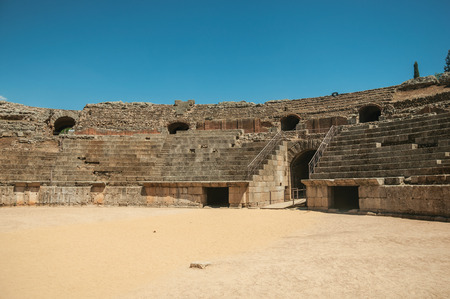 Stone bleachers and arena in the Roman Amphitheater in a sunny day, at the huge archaeological site of Merida. Founded by ancient Rome in western Spain, the city preserves many buildings of that era.