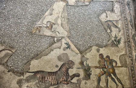 ENNA (ITALIA) - MAY 01, 2015: Mosaics in Villa Romana del Casale, Piazza Armerina, Sicilia, Italy, UNESCO World Heritage Site. Sicily, Italy