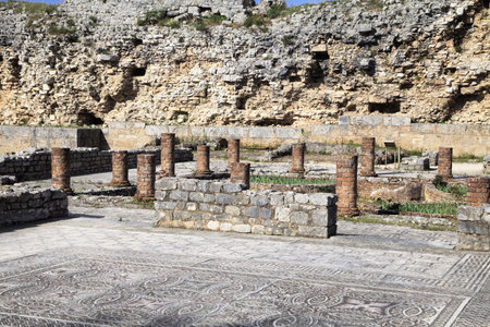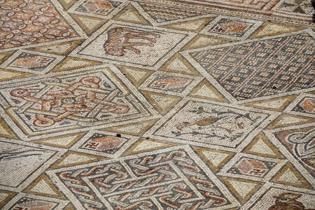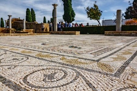 ITALICA, SPAIN, JUNE 25, 2019: Mosaics at roman ruins at Italica, Spain